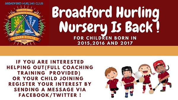 Our nursery will be returning in the coming weeks. And we really need a few more volunteer's to help guide our future hurling stars. If you can help please contact us . All help will be greatly appreciated.